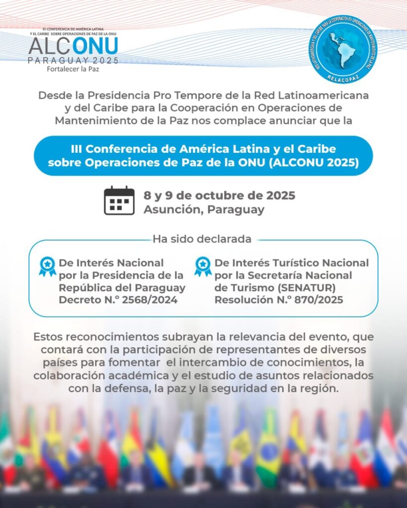 La III Conferencia de América Latina y el Caribe sobre Operaciones de Paz de la ONU (ALCONU 2025) ha sido declarada de Interés Nacional por la Presidencia de la República del Paraguay.